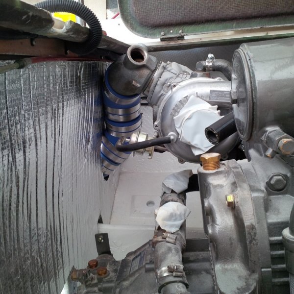 Port Side exhaust. this is a compound bend comprised of 3- 45deg silicone elbows, 2 glass coupling tubes and 12 T-Band clamps to mate up the engine elbow with the muffler